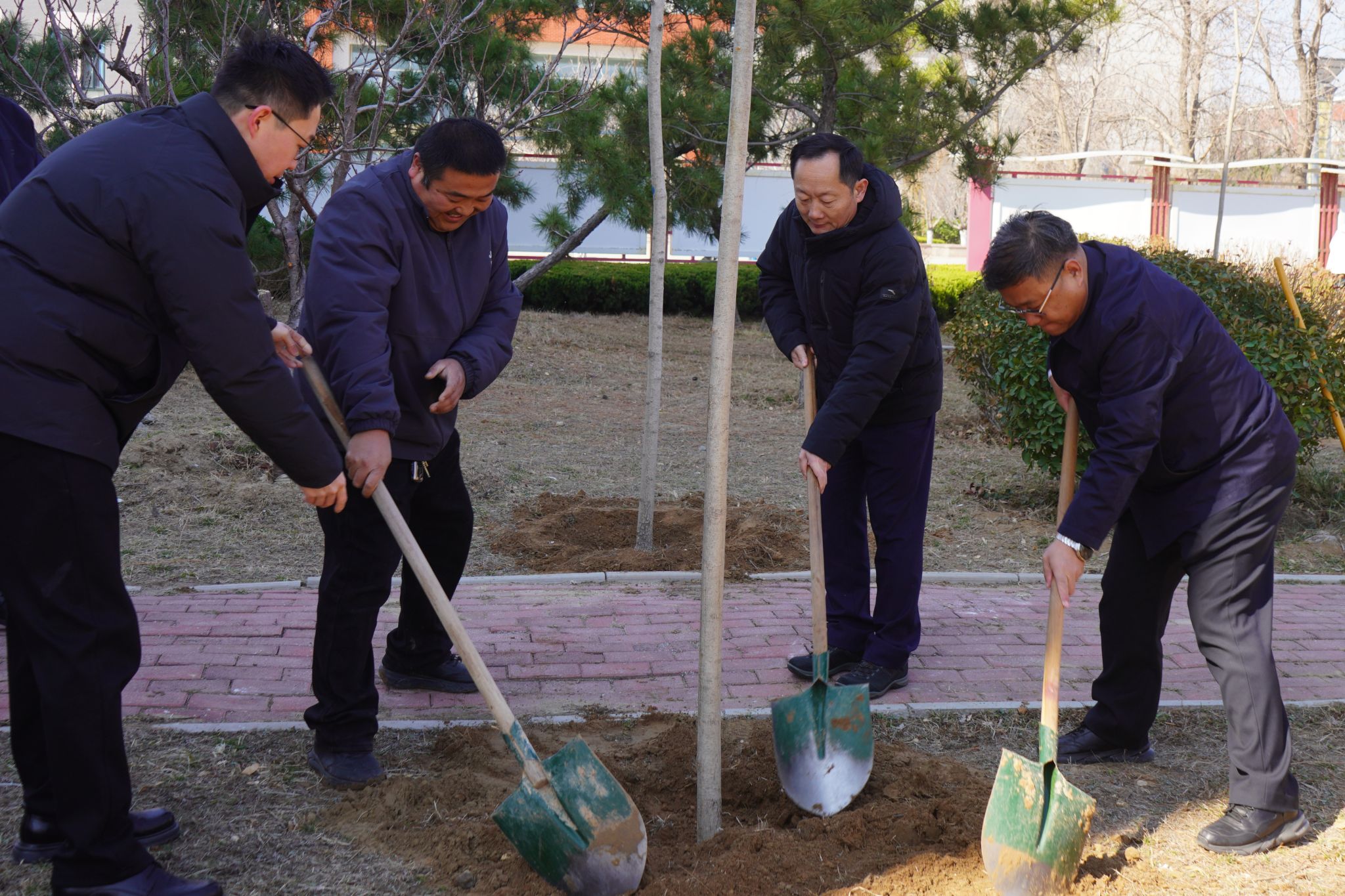 活动现场,大家精神饱满、热情高涨,自发三两成群、分工协作,扶苗、填土、压实、浇水,每一个环节认真细致、有条不紊。铁锹挥舞,新土覆根;水桶穿梭,清水润苗。师生们齐心协力、干劲十足,将一棵棵充满生机的树苗栽入校园沃土,为春日校园增添蓬勃生机。